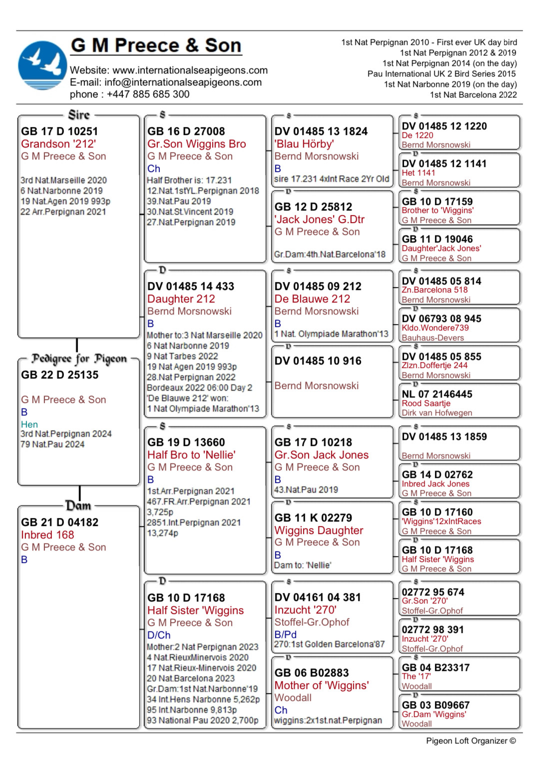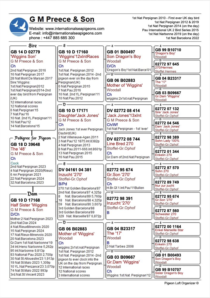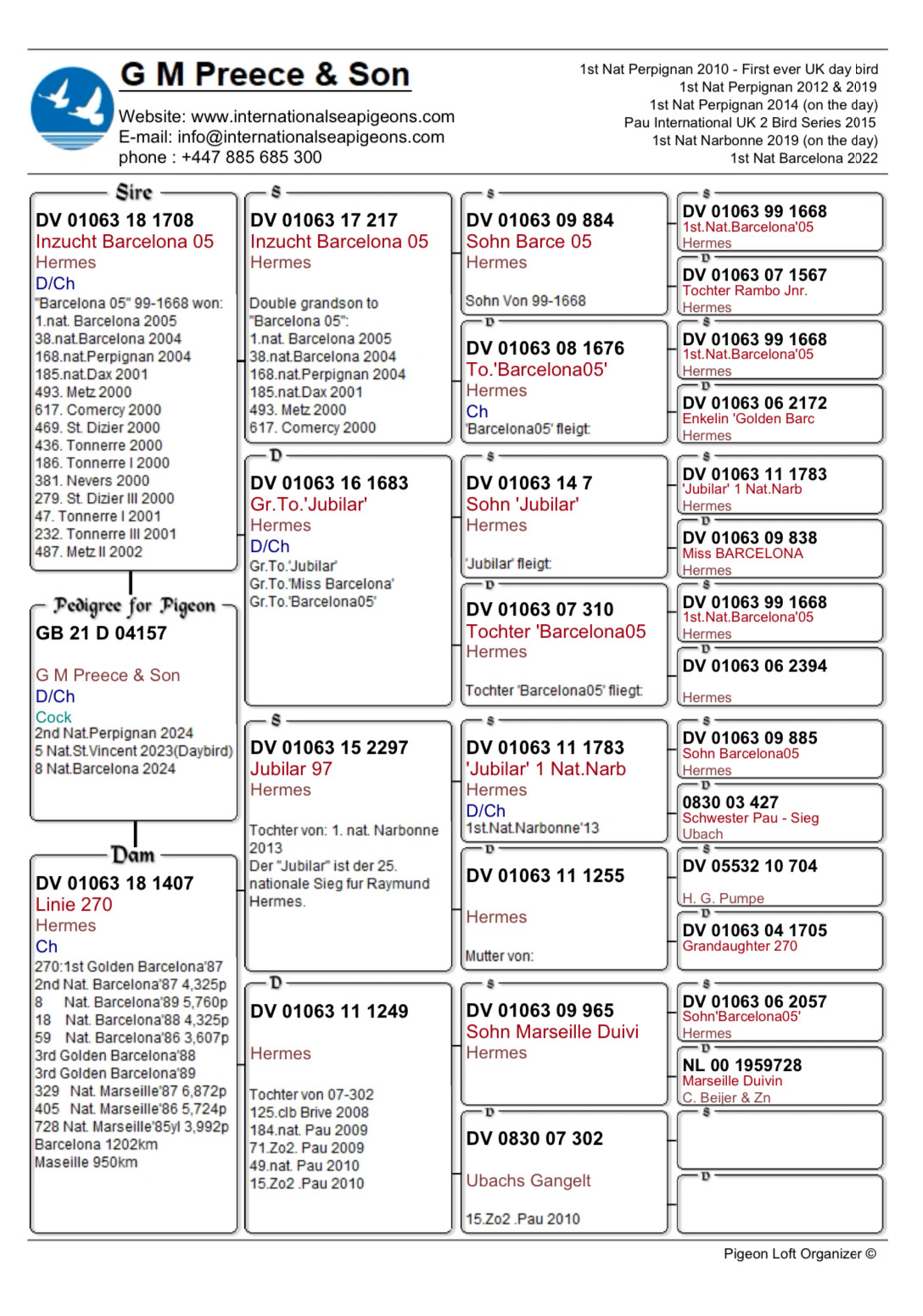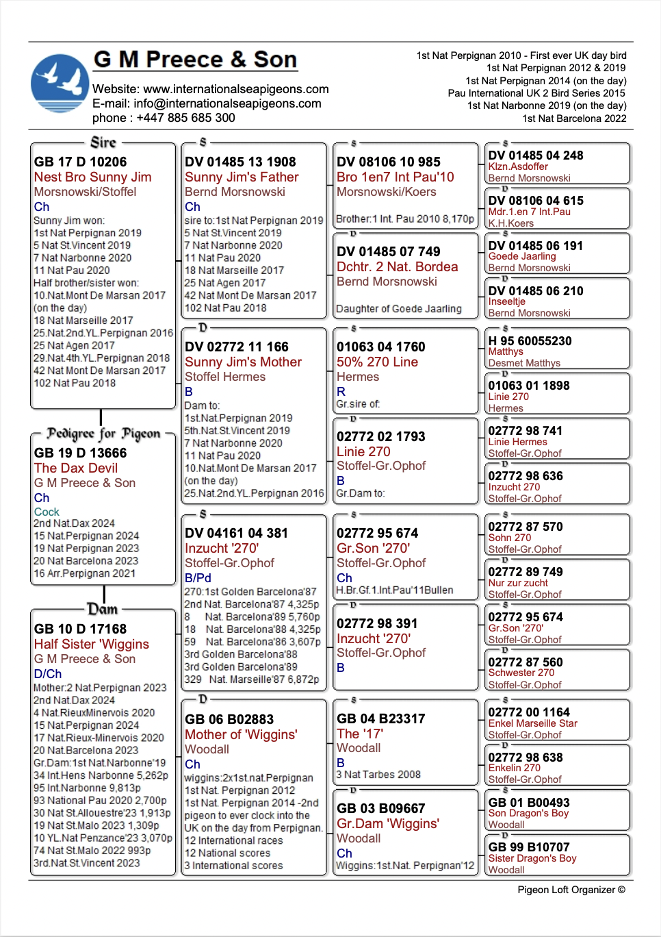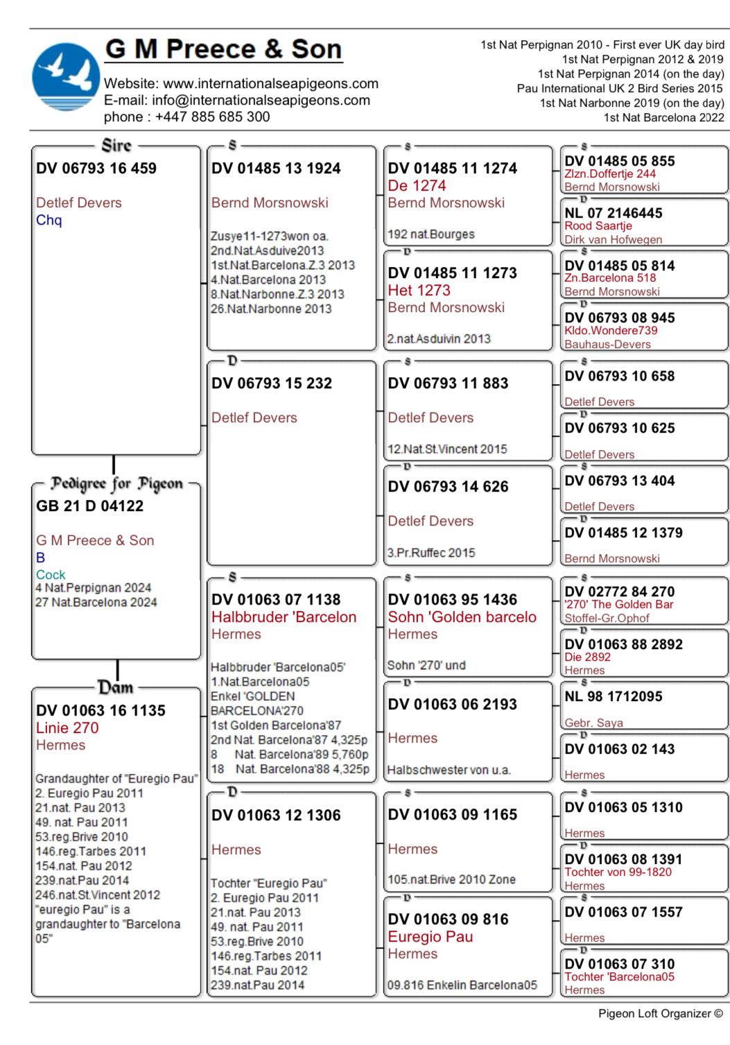 Pedigree of GB 21 D 04122 4th National Perpignan 2024. The sire is from the loft of Detlef Devers, the heading picture used for this article is of G M Preece & Son at Detlef’s loft back in 2016.