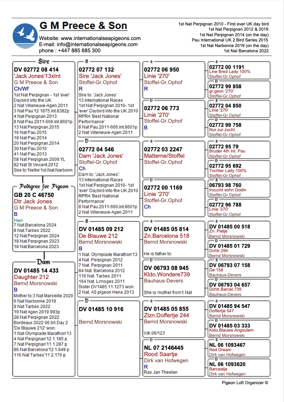 Pedigree of GB 20 C 46750 7th National Barcelona 2024 + 12th National Perpignan 2024. Direct daughter of “Jack Jones”